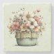 Stone coaster with a whimsical stylish pot of flowers. Green, pink and cream colours. Set in a green pot with a plaid cloth. Shabby vintage vibe.