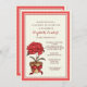 A vibrant design of a red potted plant with a subtle, tan, striped background and a red scalloped frame. Perfect for feminine birthdays, luncheons, garden parties and more.