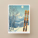 Hello from the snowy mountains of Powder Mountain, Utah, USA! We hope you're having a wonderful ski vacation. This postcard features a gorgeous blue-grey mountain landscape with retro ski boards in an orange tribal pattern.