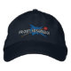 Cool percussion embroidered hat - made just for the front ensemble players! Also commonly called "the pit." A bright blue "kapow!" sign has "Front Ensemble" written in front of it, ice blue letters with a black outline. Angled in the background is a red yarn mallet. Perfect hat for anyone in marching band or drum corps. All designs are Copyright © Kamikaze Percussion.