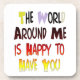 Brighten any space with our Powerful Welcome Message: A Motivational Quote! This striking artwork features bold black, red, and golden yellow text displaying the uplifting message: "The world around me is happy to have you," set against a clean white background.