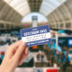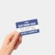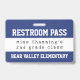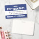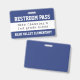 Blue student hall pass with customisable text. Restroom pass in blue and white personalised with class or teacher name, and the name of the school.