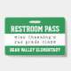 Green student hall pass with customisable text. Restroom pass in green and white personalised with class or teacher name, and the name of the school.
