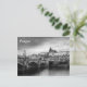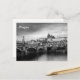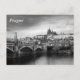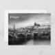 A black and white photograph of Prague Castle viewed over the Vlatva River by the Manesuv Most Bridge is featured on this postcard.