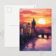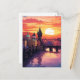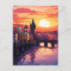 This captivating artwork depicts Prague’s iconic Charles Bridge at sunset, bathed in a fiery palette of orange, pink, and violet. The majestic gothic towers and domes of the Old Town loom under a vast sky streaked with dramatic clouds, while the golden sun descends behind the cityscape. The Vltava River mirrors the sky’s colours, intensifying the dreamlike quality of the moment. It's a vibrant celebration of Prague’s historic beauty and its timeless romantic charm.