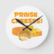 Praise cheeses! with assorted cheese wheels including cheddar and swiss.