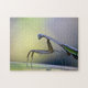 This jigsaw puzzle features a somewhat mystical image of a friendly praying mantis who stopped and posed for me several times.