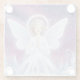 This whimsical glass coaster features a Snowy winter fairy/angel with glowing halo and translucent wings prays amid sparkling pine trees under a starry purple night sky, magical scene. Finished as a oil acrylic paint print.