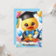 This adorable digital illustration features a cheerful yellow duckling dressed in a black graduation gown, a blue bow tie, and a classic black graduation cap with a golden tassel. The duckling is holding a rolled-up diploma tied with a pink ribbon, symbolising a joyful milestone moment. The background is beautifully decorated with colourful balloons, festive bunting, confetti, and a wrapped gift box, creating a vibrant and celebratory atmosphere. A tiny rubber duck sits among the confetti, adding an extra touch of cuteness to the scene.