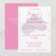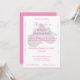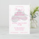 Design features a white background to the image of delicate crocheted baby booties. Text is featured in a bright pink, the name of guest of honour in a large, elegant font. Event type is displayed in a large, bold font. Message, date and time are displayed below in an easy-to-read print. R.S.V.P. information is displayed at bottom. An elegant flourish borders design.