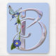 A fancy font "B", textured in metal and decorated with morning glories winding around the left side plus a colourful butterfly landing on the flowers.