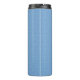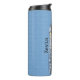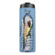 Cool personalised thermal tumbler, with graphic artwork of a great white shark trapped in a water bottle, against a blue swirl wave background. Personalise the custom black text to suit your needs.