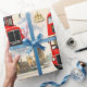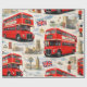 Wrap your gifts in the timeless charm of the British capital with this vintage London premium wrapping paper this beautifully detailed collage features the most iconic symbols of London including the classic red double-decker Roma bus the Majestic Big Ben, the houses of Parliament and stoic Royal guard in a traditional bar skin hat accented with the Union Jack flag and classic black cabs against a soft cloudy