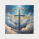 Blue cross among clouds with golden typography design.