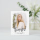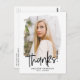 Trendy, modern graduation thank you postcard featuring the graduate's photo inside of a textured mask frame with "Thanks!" in a black handwritten script. Personalize the front of the graduation thank you postcard by adding the graduate's name and graduation year. The postcard reverses to display your return address and custom message.