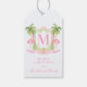 This Christmas gift tag has a preppy design featuring a Christmas crest with palm trees and flamingos wearing Santa hats. The bottom has pink text that says "Merry Christmas." You can personalise with a name, year and your initial.
