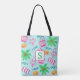 Personalise this preppy beach scene bag with an initial and give it as a gift or favour. This beach scene with beach bags, bikinis, palm trees, sunglasses, beach bags, and beach hats can be found on other products in my store, PageCreativeDesigns.