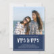 A photo wedding invitation for a lesbian wedding with a photo of the brides to be and mrs and mrs written in a large brush font against a navy blue background.