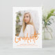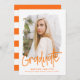 Trendy graduation party invitations featuring the graduate's photo inside of a textured mask frame with "Graduate" in an orange handwritten script. Personalize the front of the photo graduation party invites by adding the graduate's name, school name, and graduation year. The invite reverses to display your graduation party details with an orange and white striped pattern.