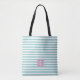 Preppy Tote bag with light blue background and white stripes. Custom three part monogram is written in serif font which can be personalised.