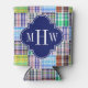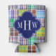 Preppy Patchwork Madras Navy Quatrefoil Monogram Can Cooler