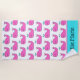 This fun beach towel features adorable pink whales with cute aqua blue spouts. Personalise the matching aqua and pink stripe with your choice of name or special text.