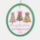 This cute Christmas holiday personalized ceramic ornament features three preppy Christmas trees in girly shades of pink and green with fun bows at the top. The back features girly pink and white polka dots and can be personalized with your choice of special holiday message. Great for gift bags and party favors.