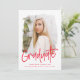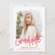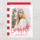 Trendy graduation party invitations featuring the graduate's photo inside of a textured mask frame with "Graduate" in a red handwritten script. Personalize the front of the photo graduation party invites by adding the graduate's name, school name, and graduation year. The invite reverses to display your graduation party details with a red and white striped pattern.