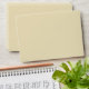 A simple light yellow envelopes with your name and address pre printed on the back flap in elegant magenta sans-serif font. Envelopes have