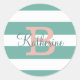 Pastel background in turquoise, navy blue and coral with white stripes and a double monogram in a combination of serif and handwritten script font.