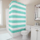 Preppy shower curtain featuring a turquoise and white stripes pattern.
