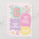 pastel varsity preppy patch 6th birthday invitation with hearts, daisies, disco ball and chequered background.