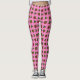 These festive leggings feature retro red Christmas presents with green bows on a pink background with holly leaves and berries.