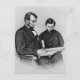President Abraham Lincoln reading with his son Tad in this 1864 print made from the famous Brady photograph for the weekly newspapers of the time.