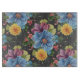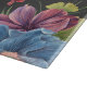 Beautiful rectangular cutting board has large painted primary blue flowers with smaller ones in marigold yellow, purple and pink, all on a charcoal grey background giving it a dark and elegant look. Matching items available for bed, bath and throughout the home