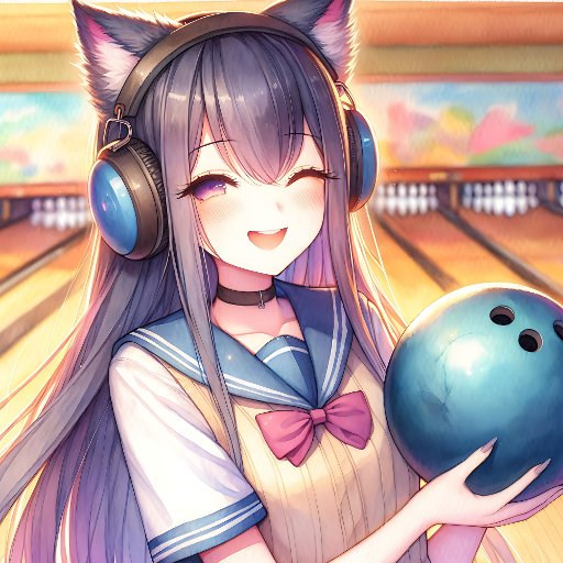 Anime themed birthday gift wrap. Cute anime girl wearing headphones with cat ears holding a bowling ball. Cute pink and blue bowling girl's birthday party theme for gamer girls or music lovers or those that love the furry theme.
