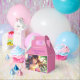 Birthday party favour boxes. Pretty ai art depicting a beautiful girl with pink and purple flowers on her head holding a birthday cupcake.