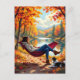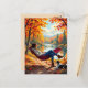 Pretty Fall themed postcard with an ai illustration of a woman relaxing in a hammock and a background of orange Fall leaves reflecting in a little pond. A dog relaxes on the ground next to her.