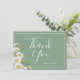 Pretty floral Spring / Summer themed wedding thank you card design features watercolor white daisies corner on trendy 2022 basil green background with white customisable text blocks in modern fonts