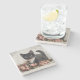 The coasters are gorgeous, a quality feel and heavy weight. They look like a precious archeological find. A rustic stone juxtaposed with a modern floral black and white print. I like the way the print goes slightly imperfect on the cut stone edges giving them a kind-of natural beauty.