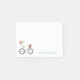 Pretty post it note pad done in white, with graphics of a peach and green lady's bike, with a basket of flowers and balloons, decorating the bottom of the pad. Custom green text is ready to personalise.