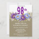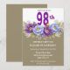 Celebrate a remarkable milestone with this elegant 98th birthday party invitation featuring a stunning floral design in rich purple and soft blue peonies accented with delicate greenery. Perfect for honoring a special woman, this sophisticated invitation blends timeless beauty with a modern touch, making it ideal for a memorable and heartfelt celebration.