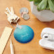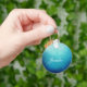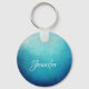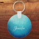 A keychain with a pretty blue half mandala pattern with a background gradient colour of light sea blue transitioning into a dark navy blue.