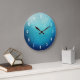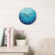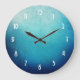 A clock with a pretty blue half mandala pattern with a background gradient colour of light sea blue transitioning into a dark navy blue. Tranquil and serene. White clock face in an art deco font.