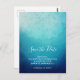 Save the date postcard with a pretty blue half mandala pattern with a background gradient colour of light sea blue transitioning into a dark navy blue. Tranquil and serene.