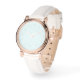 Elegant rose gold coloured ladies ewatch watch with white leather band. Light blue aqua background with minimalist light-toned watch numbers.
