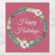 Modern Boho style holiday wreath watercolor illustration has fir branches, holly leaves & berries, and even a few feathers. Customise with your own holiday message on berry colour background