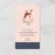 Business cards with a pretty brown deer with a white spotted back. A little bird sitting on the deer's back. A fancy floral bouquet with watercolor roses and light olive green leaves under the deer's feet. A blue watercolor rectangle behind the image. Innocent and sweet design with rustic elegance. Peach coloured background.