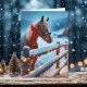Christmas card. A pretty brown horse with a red bow on his neck standing behind an old rustic wood fence with a snowy background and vintage old red barn. The snowfilled fence is adorned with illuminated Christmas lights to give a warm festive feel to your country Christmas card.