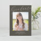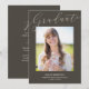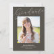 This elegant graduation photo card features calligraphy and a large photo. On the front, "Graduate" is written in pretty calligraphy script across the top, with a large photo below. At the bottom, you can add the graduate's name, school, and graduation year. The typography is light cream against an ash brown background. The back of the graduation card includes an optional template to add graduation party details.